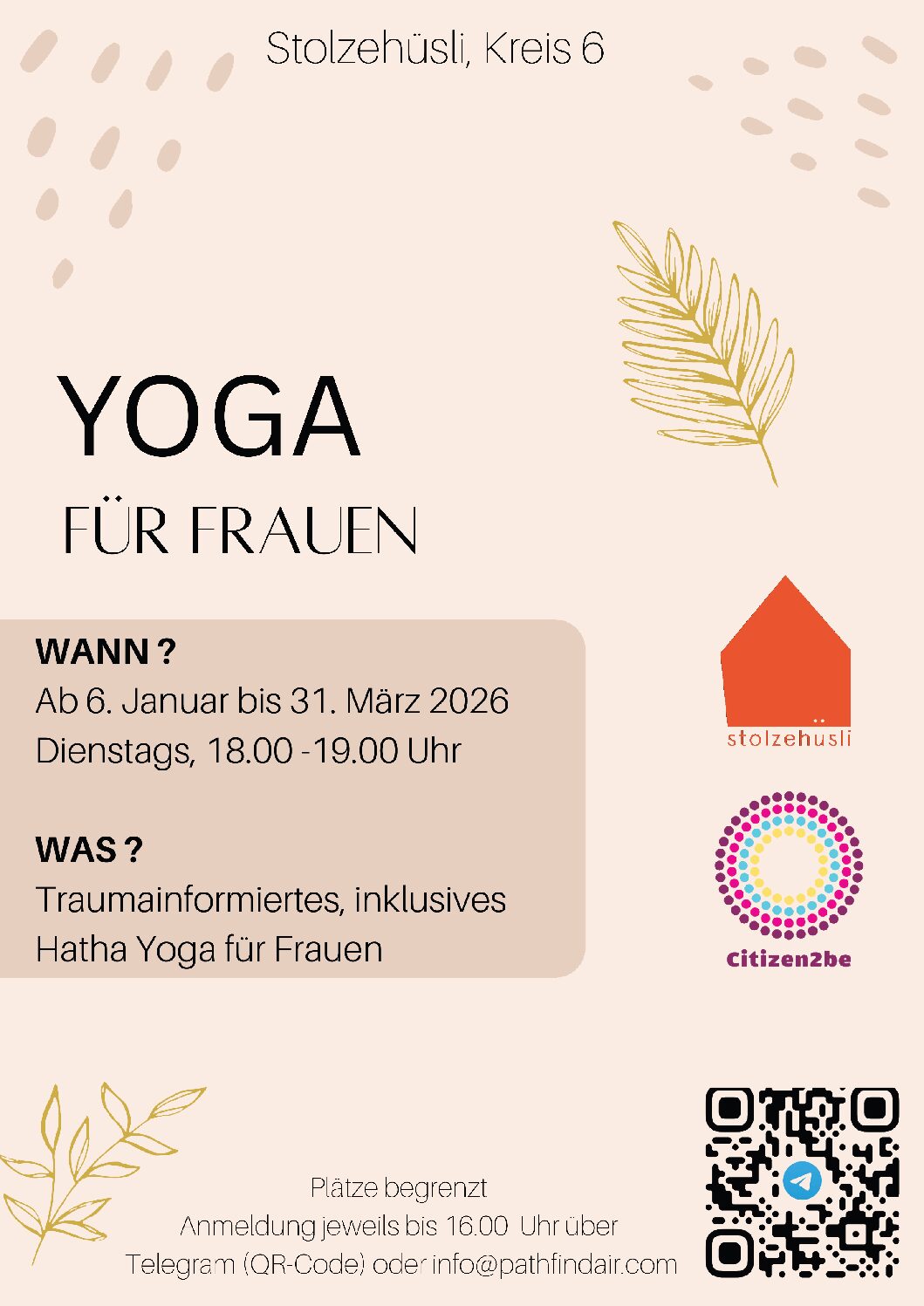 Josefine möchte die geschlossenen Monate beleben und bietet jeden Dienstag bis Ende März von 18–19 Uhr ein Yoga für Frauen im Hüsli an. Meldet euch gerne bis am selben Tag bis 16 Uhr via Telegram-QR-Code unten oder info@pathfindair.com an.